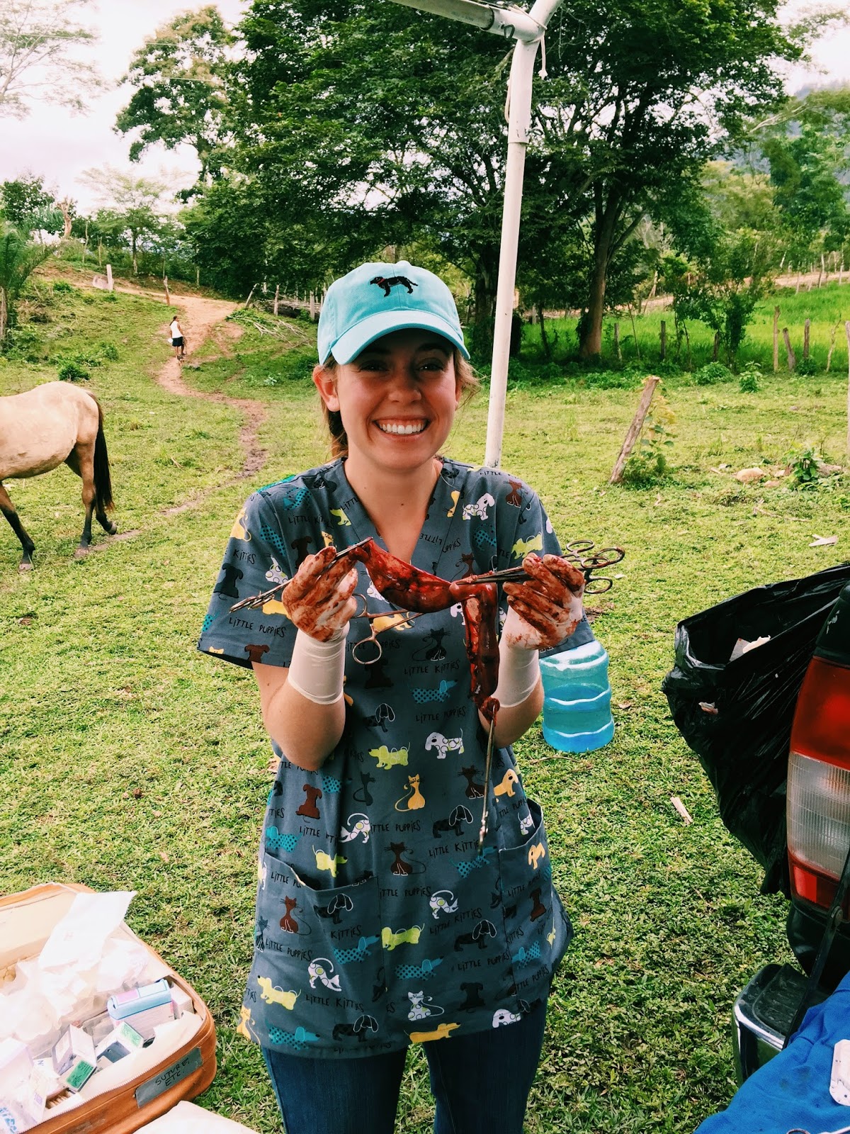 I'll spare the dirty details, but Dr. Todd showed me how to do it on one testicle (or "juevos" is the slang spanish term for balls) and then he let me go alone on the second! It's hard because you're leaning over the rump of the beast, squatting down, but also, pretty fun because everything is just so much bigger than a dog neuter! Also, we literally use a tool called an emasculator. It clamps down and also has a cutting feature all in one. Dr. Todd told me I did a beautiful job and we let him wake up! If you're interested.. a video will be at the bottom of this page.